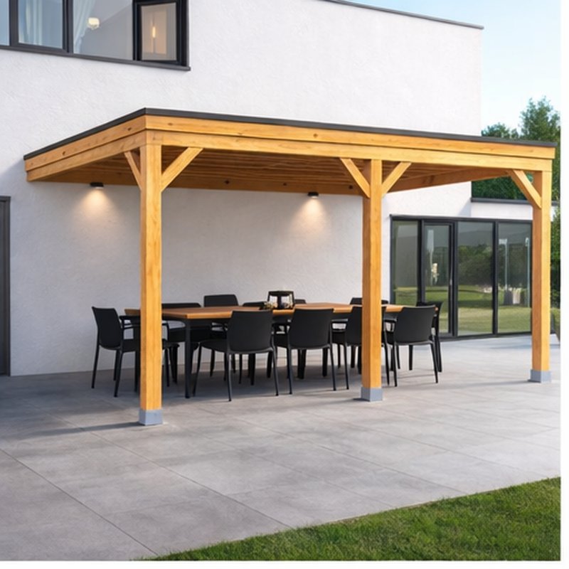 Los postes de sección cuadrada de 12×12 cm forman una base firme y segura. Su tamaño proporciona estabilidad frente al viento y al peso del techo, sin comprometer la estética.